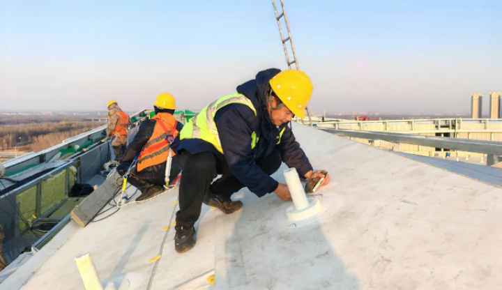 東北的冬季是最大考驗。三新專項技術組優化圍護工藝,攻克低溫TPO 焊接難題;排水天溝內置精準電伴熱系統,杜絕凍堵風險;光伏支架立桿采用高分子包封件,實現防水與發電的無縫銜接。當抗風揭試驗室的模擬狂風掠過屋面,這頂 “鳳冠” 用數據證明:它不僅是建筑的外衣,更是自然的摯友。